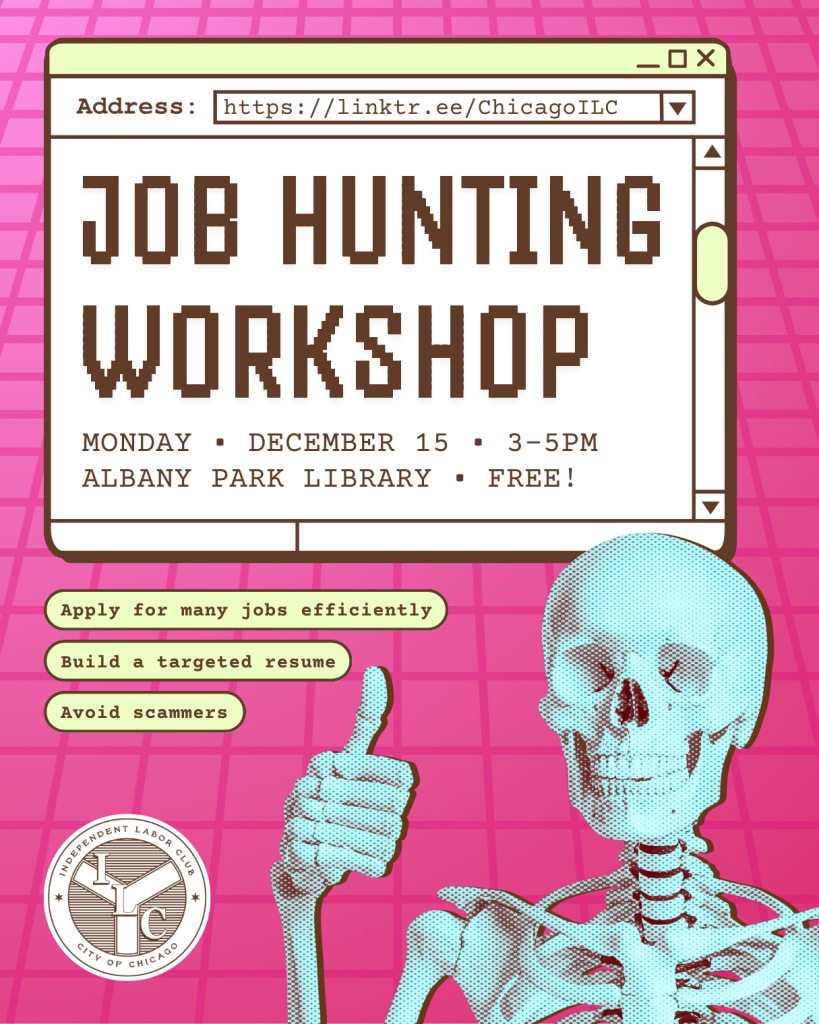 Looking for a job is the worst, but you don’t have to do it alone! Join us on Monday, December 15th from 3-5pm at the Albany Park library branch for our next Job Hunting Workshop. An ILC Chicago member will show you how to apply for many jobs efficiently, build a targeted resume, and avoid scammers.